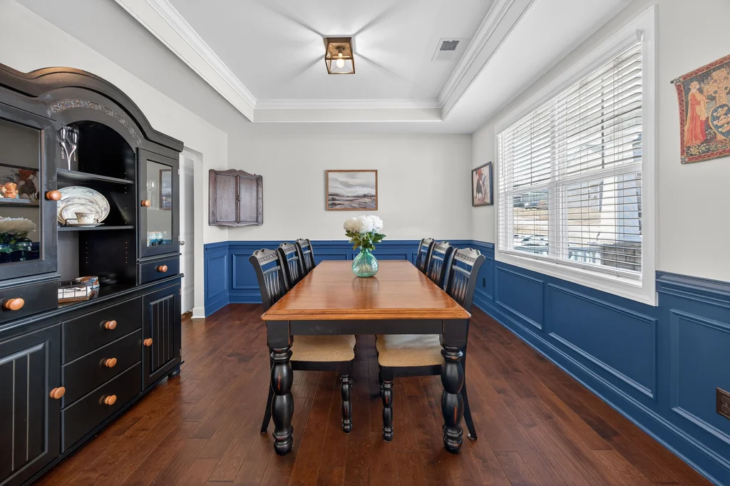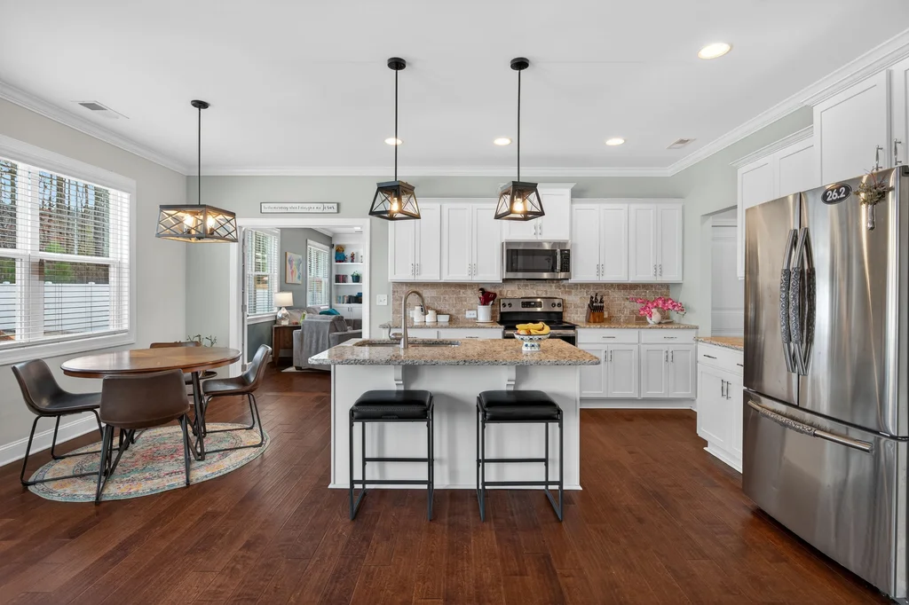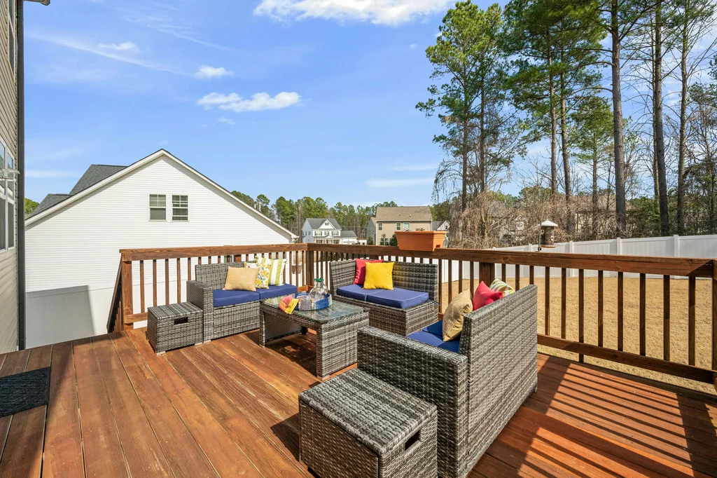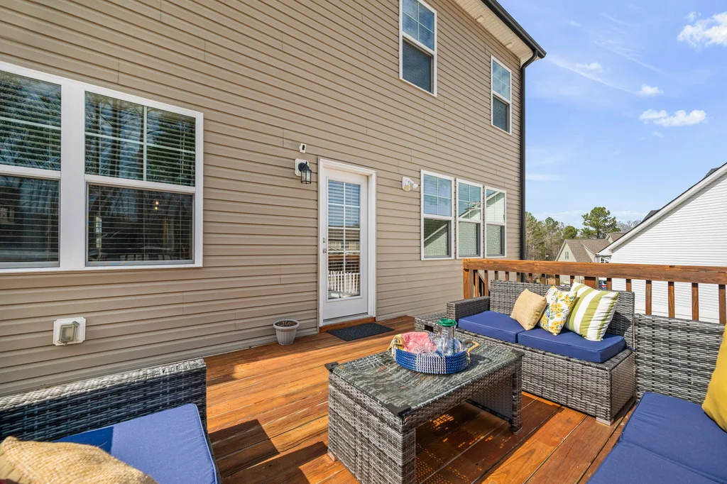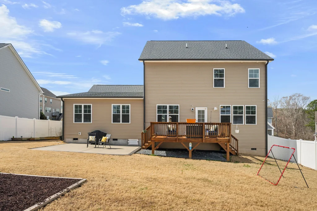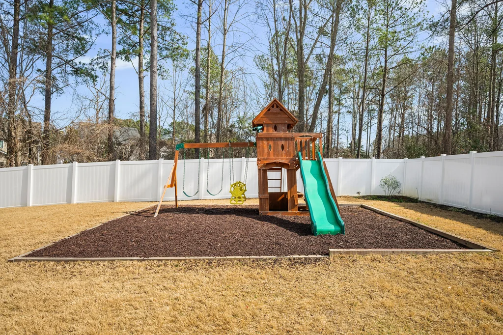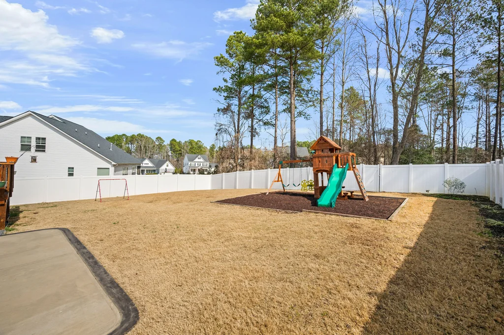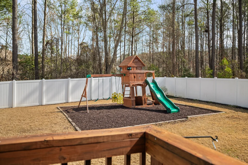 Outdoor living shines with a large deck overlooking the patio and a fully fenced, expansive backyard that backs to a wooded buffer. Oversized patio is perfect for outdoor games or a second gathering area. Playset stays with home.
