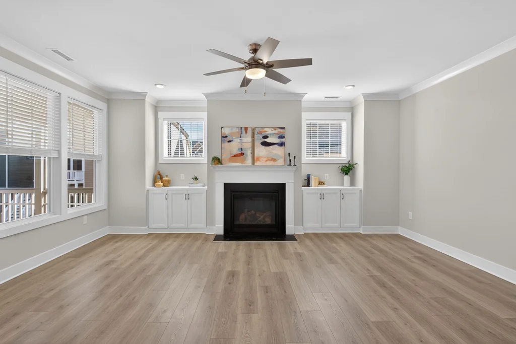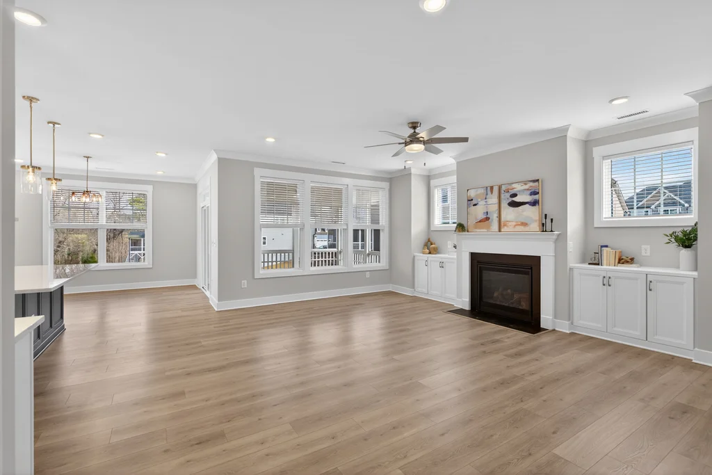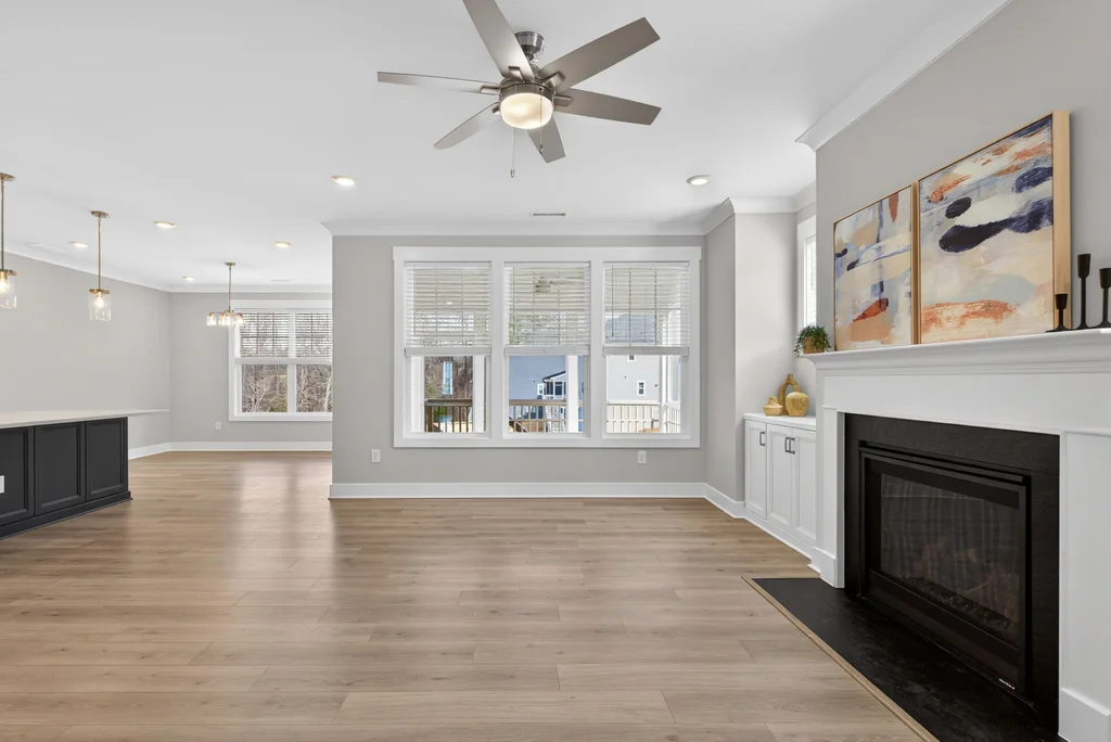The chef’s dream kitchen is perfect for everything from weeknight dinners to entertaining, featuring a gas cooktop, double ovens, oversized island, soft-close cabinets, generous counter space, and a large walk-in pantry. It flows seamlessly to the living room, where a fireplace with custom built-ins creates a warm and inviting centerpiece.