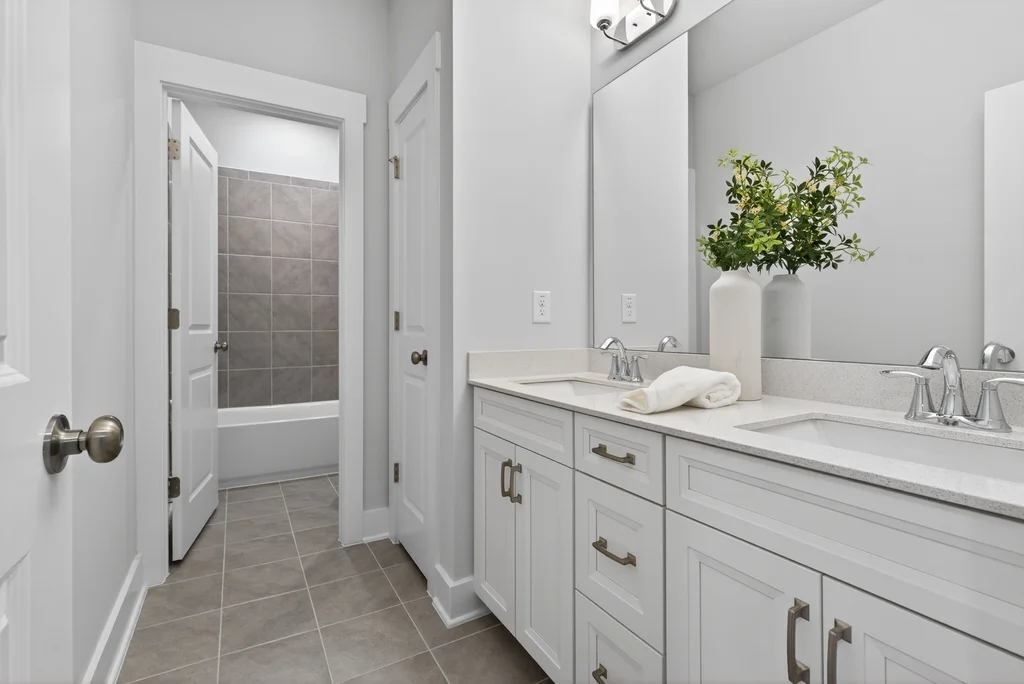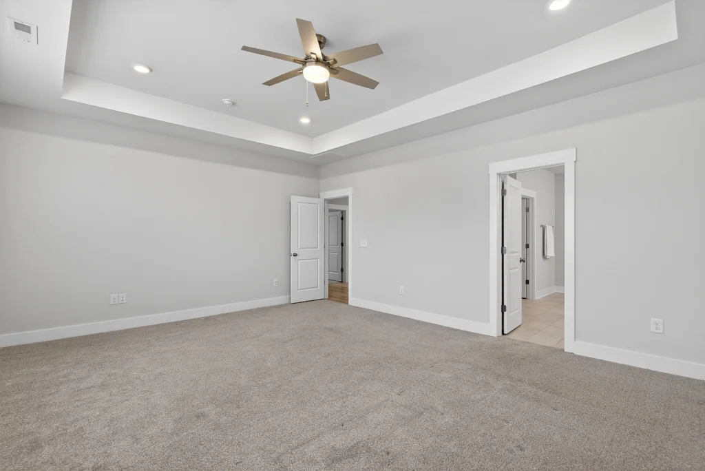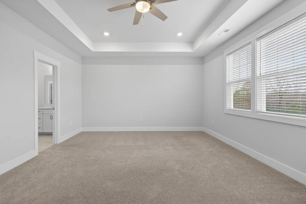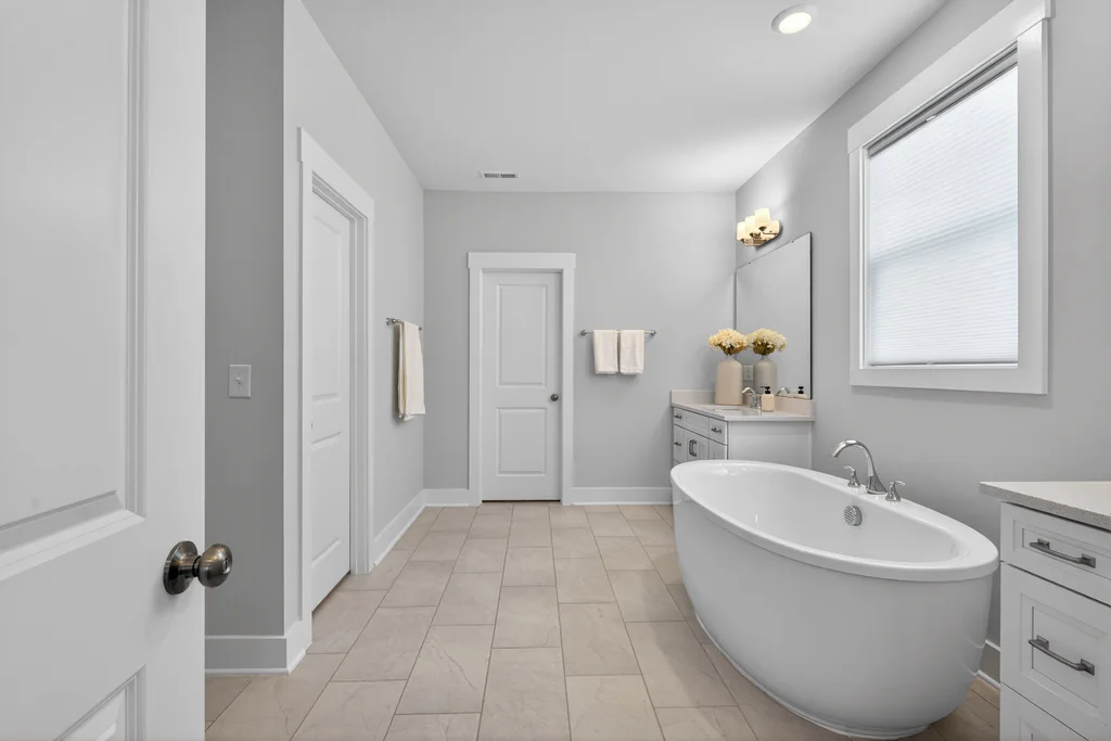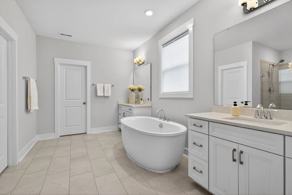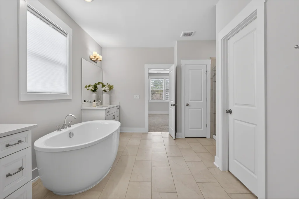 The first floor also offers a private guest suite with a full bath and a dedicated office, ideal for working from home or a quiet retreat. Upstairs, a spacious loft leads to three additional bedrooms. Two of the bedrooms share a Jack-and-Jill bathroom, while the third has its own full bath. The generously sized owner’s suite serves as a true retreat, featuring a spa-like bathroom with a tile shower, vessel tub, dual vanities, and custom built-ins in the walk-in closet for ultimate organization and luxury.