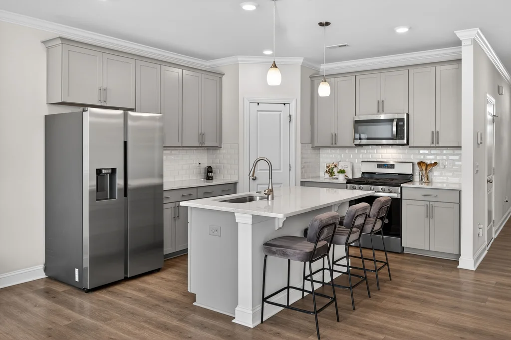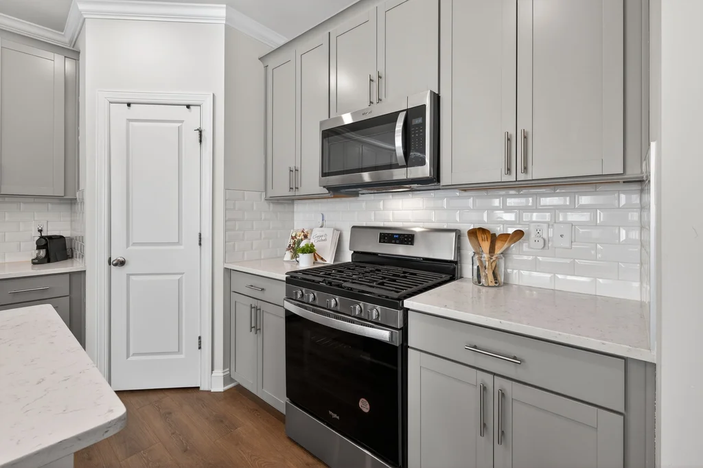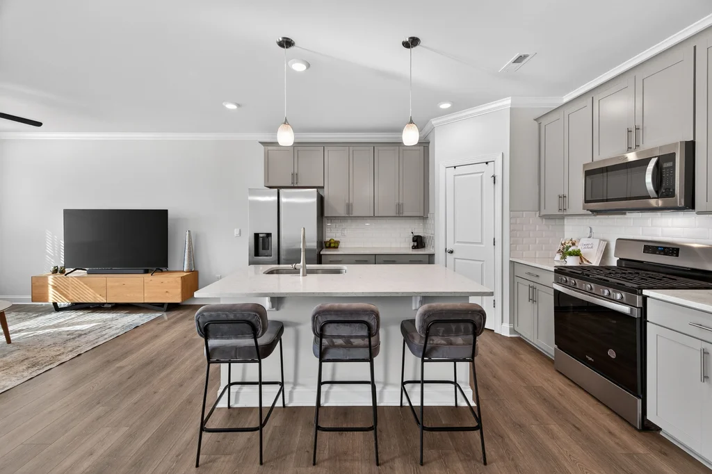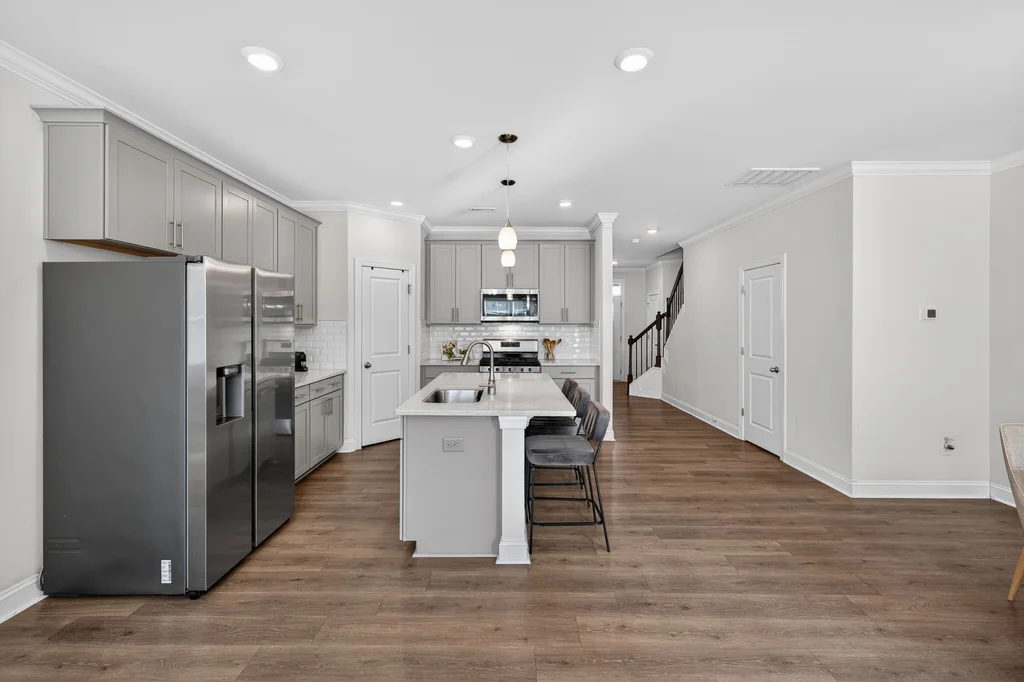 The main level features a seamless flow between the kitchen, dining, and family room all in one expansive space that opens to a private patio and fenced backyard. The kitchen is finished with gray cabinetry, quartz countertops, tile backsplash, and stainless-steel appliances, offering a clean, modern look that feels both stylish and practical. RevWood flooring runs throughout the main living areas, with tile flooring in the bathrooms and laundry for durability and easy maintenance. A covered front porch adds even more outdoor living space.