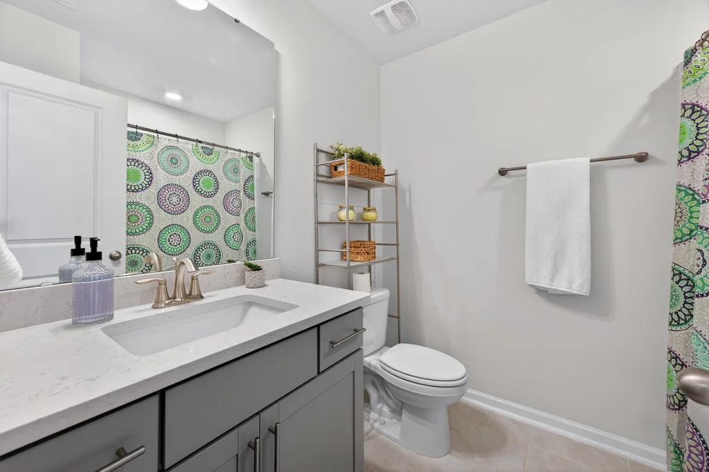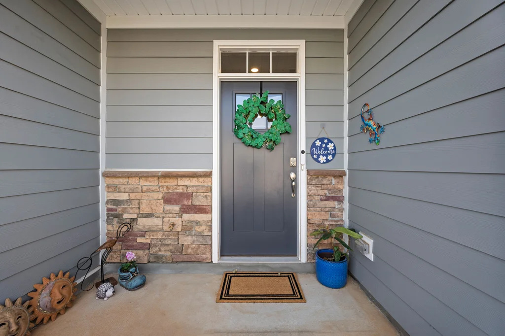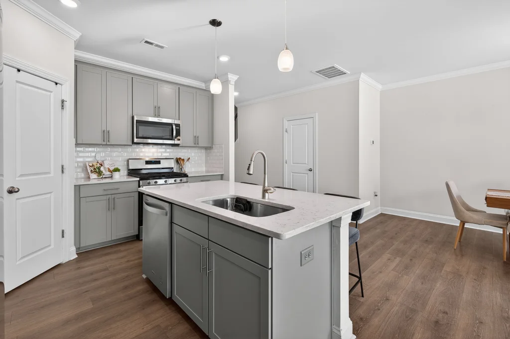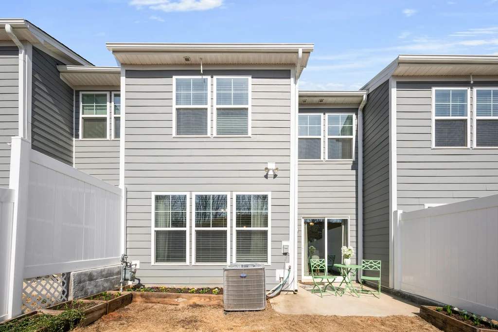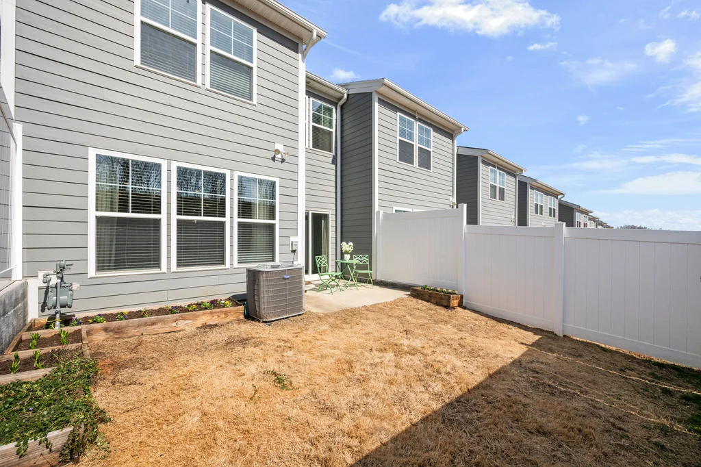 The main level features a seamless flow between the kitchen, dining, and family room all in one expansive space that opens to a private patio and fenced backyard. The kitchen is finished with gray cabinetry, quartz countertops, tile backsplash, and stainless-steel appliances, offering a clean, modern look that feels both stylish and practical. RevWood flooring runs throughout the main living areas, with tile flooring in the bathrooms and laundry for durability and easy maintenance. A covered front porch adds even more outdoor living space.